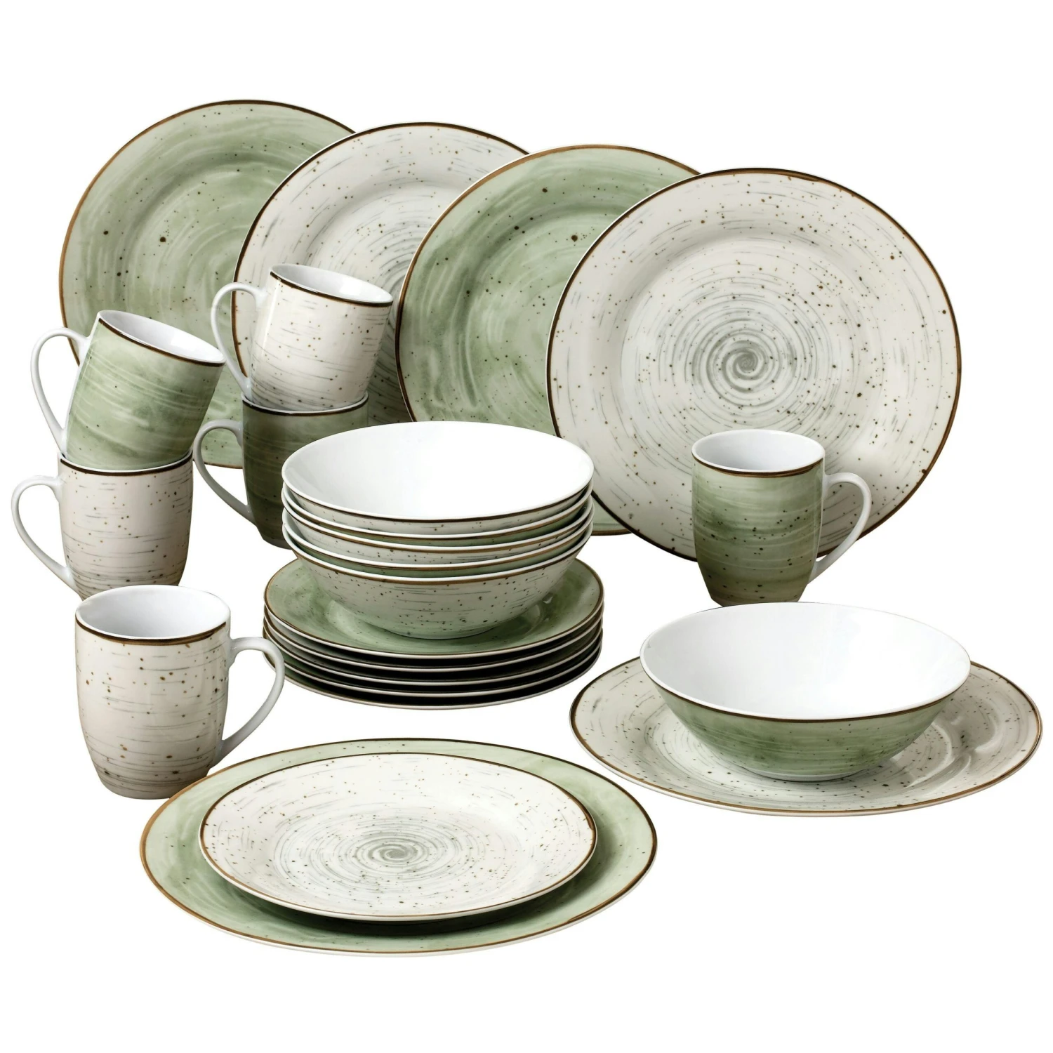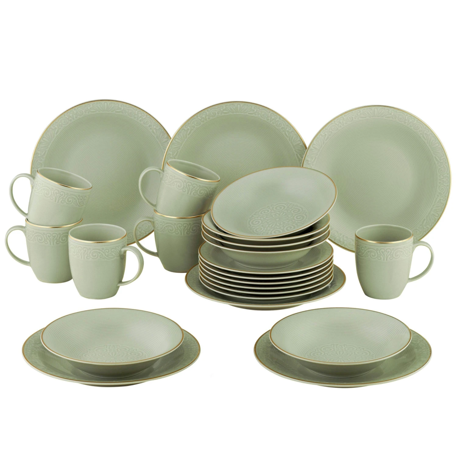 Das 24-teilige Set beinhaltet vier Geschirrteile, in jeweils zwei Farben und dreifacher Ausführung. Beide Farbvarianten haben ockerfarbene (beinah goldene) Ränder, die Speisen und Getränke stilvoll rahmen. Die hellere Variante im sanften Elfenbeinton ist künstlerisch schraffiert und bildet einen hervorragenden Kontrast zum Strudeldekor im sanften Moosgrün. Zudem ist die Kollektion abstrakt gepunktet. Unter- und Innenseiten sind schlicht, in Weiß (Lichtgrau) gehalten.