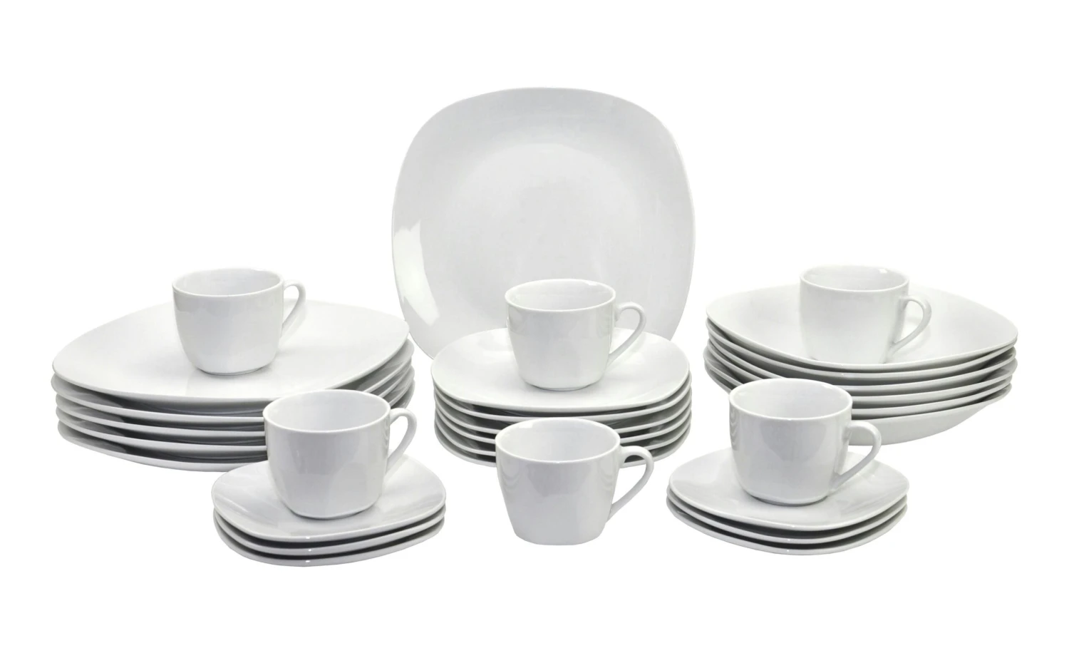 Servieren Sie Tee und Kaffee in den formschönen Tassen und nutzen Sie zum Anreichen die geschwungenen Untertassen im Format 14 x 14 cm. Die 21.5 x 21.5 cm großen Frühstücksteller eignen sich alternativ für den Verzehr von Kuchen, Snacks und Dessert. Für Müsli, Suppe und Salat stehen Ihnen die 5 cm hohen Servierschalen zur Verfügung und für den Hauptgang nutzen Sie einfach die großen Jumboteller im Format: 27 x 27 cm.