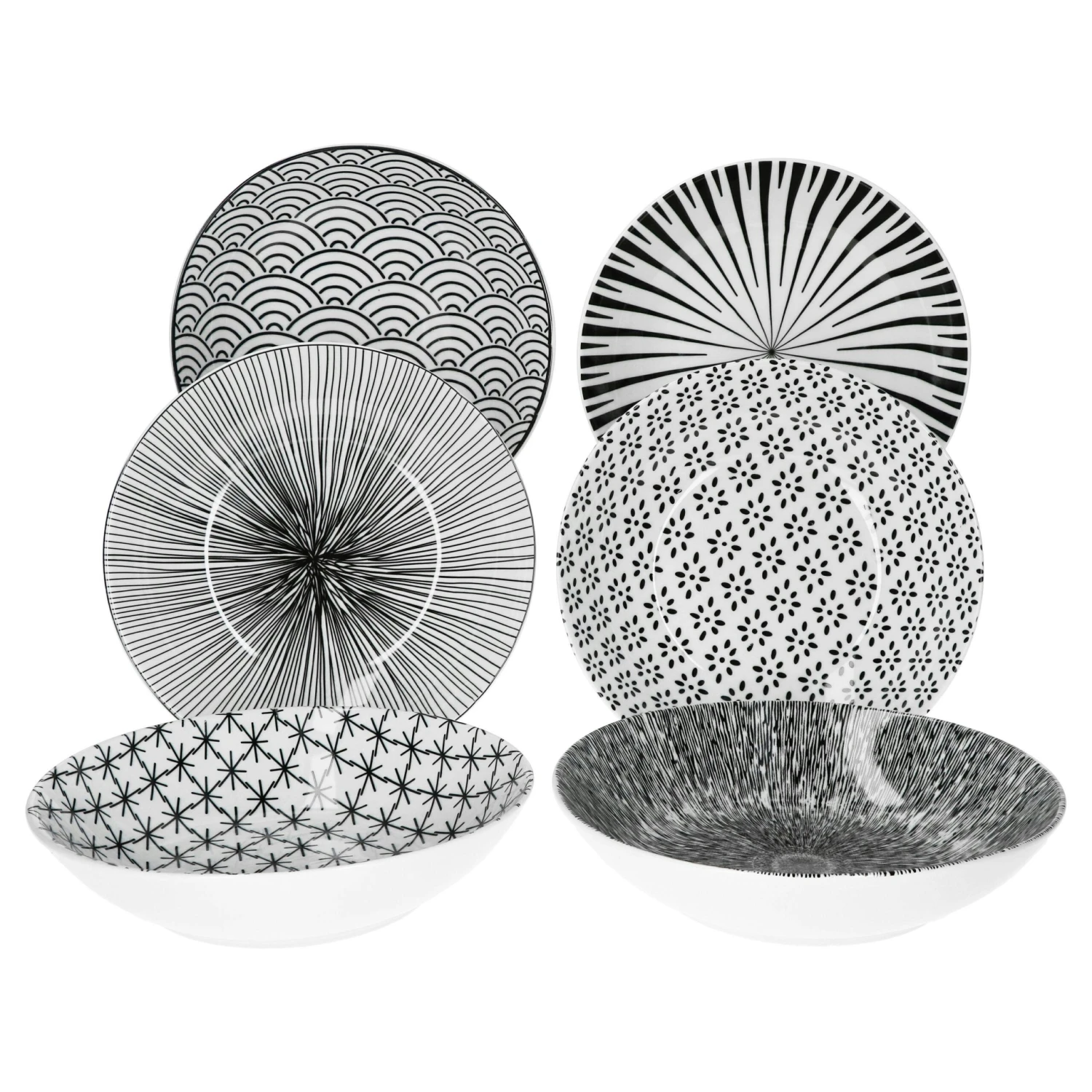 - Das vollflächig dekorierte Geschirr überzeugt mit seinem schwarz/weißen Design und seinen sechs unterschiedlichen Mustern