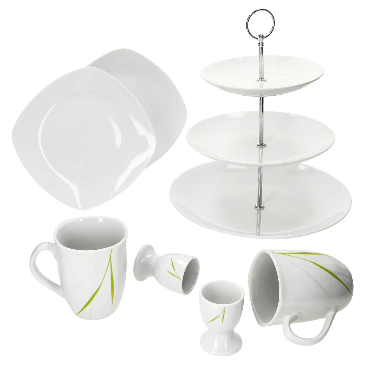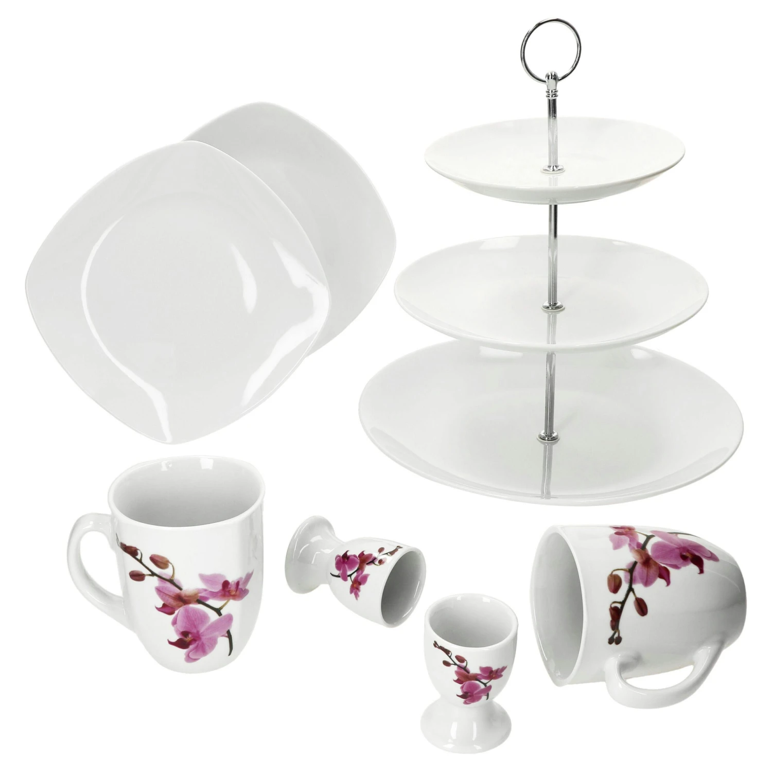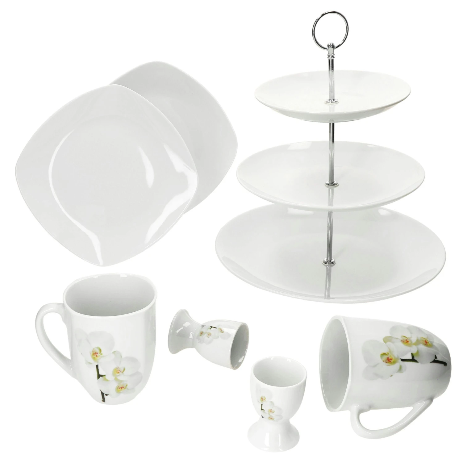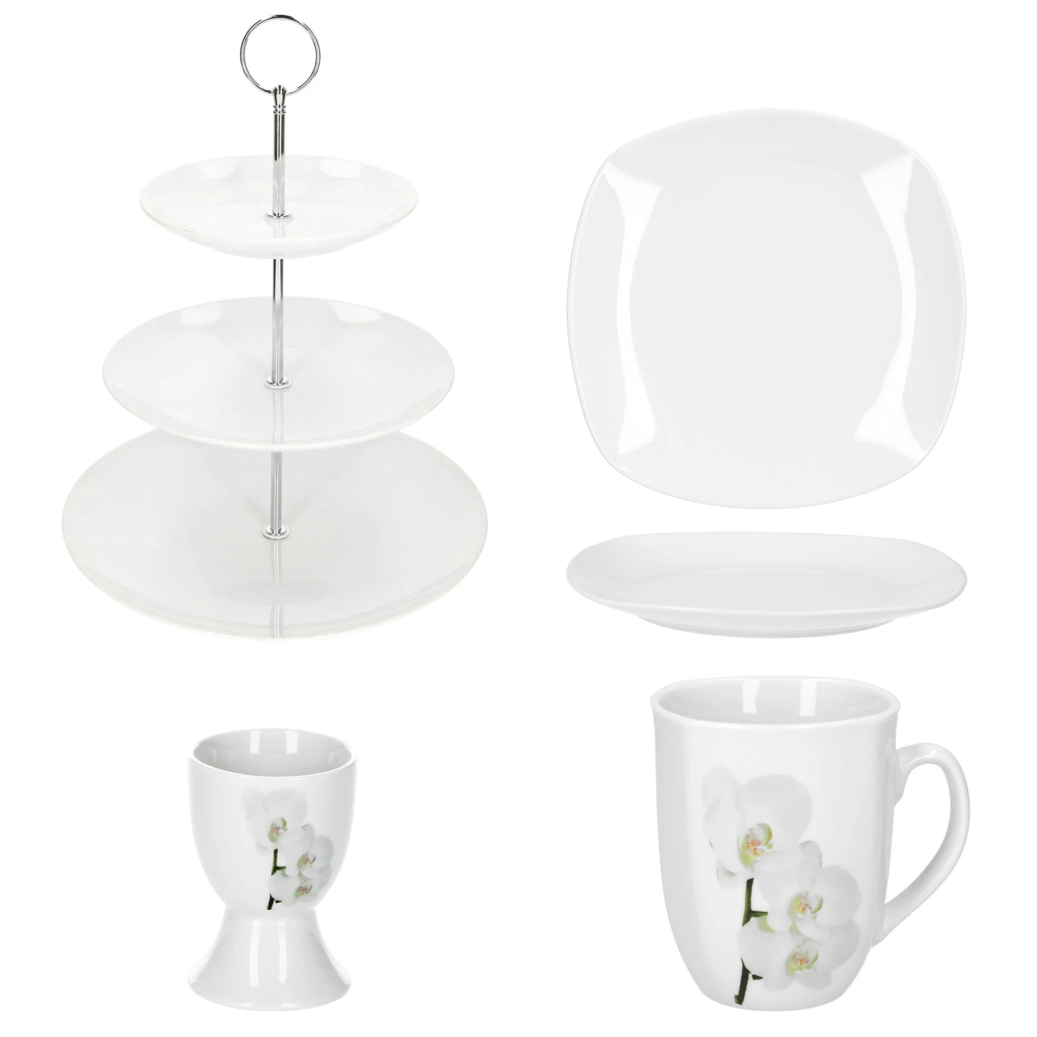 Versüßen Sie Ihren Morgen mit diesem hübschen Set mit floralem Dekor und sorgen für ein angenehmes Ambiente. 7-teiliges Lilli Vanda Frühstücks-Set Etagere 1x Etagere (3-stöckig), 2x Eierbecher, 2x Kaffeebecher 300 ml & 2x Frühstücksteller Alle Teile des Sets sind aus Porzellan gefertigt und Teller, Eier- & Kaffeebecher sind für 2 Personen geeignet Mit diesem schönen Etageren Set können Sie für Ihren Partner und sich ein außergewöhnliches Frühstück oder Kaffee kreieren und sorgen für unvergessliche Momente Die Etagere sowie die kleinen Teller sind schlicht in Weiß gehalten, während die Eierbecher und Tassen mit weißen Orchideen auf der Vorder- und Rückseite verziert sind Der Eierständer eignet sich hervorragend zum Servieren des klassischen Frühstückseies Mit einer Füllmenge von 300 ml ist der Pott ideal für Tee, Kaffee, Cappuccino, Latte Macchiato, Kakao sowie andere Heißgetränke Die Etagere hat drei unterschiedlich große Teller (Ø 16 cm, Ø 21 cm & Ø 27 cm) auf denen selbstgemachte Plätzchen, Bonbons & Pralinen sowie Mini-Muffins, Brownies & Co bereitgestellt werden können Servieren Sie auf dem Dessertteller sowohl Kuchen, Brownies als auch am frühen Morgen frische Brötchen oder Croissants Die Becher (mikrowellengeeignet), Eierbecher, Teller sowie die Platten der Etagere sind spülmaschinengeeignet Farbhinweis: Abweichungen in Farbe und Design sind Bestandteil des Handwerks Lieferumfang: 1x Etagere, weiß 3-stöckig Ø 27 cm, Gesamthöhe 34 cm, 1.400 g 2x Eierbecher Jeweils: Ø 5 cm, Höhe 7 cm, 60 g 2x Kaffeebecher Jeweils: optimale Füllmenge 300 ml bis max. 350 ml Länge 8,5 cm, Breite 8,5 cm, Länge mit Henkel 11,5 cm, Höhe 10 cm, 30 g 2x Kuchenteller, weiß Jeweils: Länge 19 cm, Breite 19 cm, Höhe 1,5 cm, 300 g