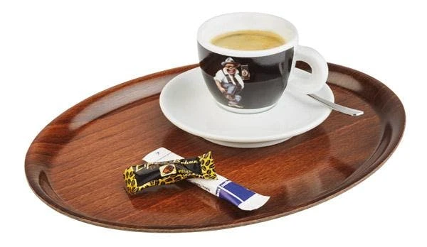 Ausführung: • Tablett aus Holzdekor-Laminat • mit Antirutsch-Oberfläche • ovale Form • Rand eingerollt • abwaschbar • nicht spülmaschinengeeignet • stapelbar