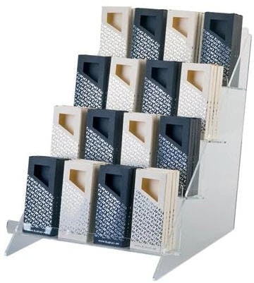 Ständer aus Plexiglas für Schokoladentafeln, Snacks, (Post-) Karten oder andere „Kleinigkeiten“. 4 Etagen auf der Vorder- und Rückseite. Abmessung: 315 x 410 x 370 mm . Ohne Dekoration
