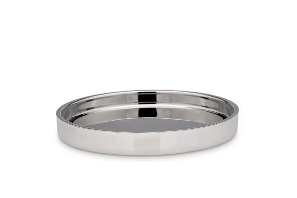 Rundes Galerie-Tablett in glatter Optik, aus Edelstahl. Das Tablett hat eine Höhe von 4,0 cm und einen Durchmesser von 32,0 cm.