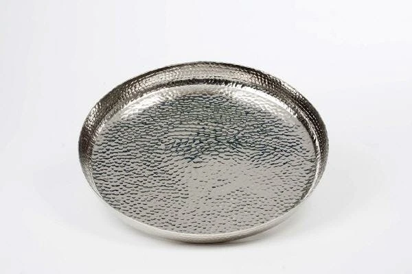 Tablett aus Aluminium vernickelt.Der Durchmesser ist 44,0 cm und die Höhe ist 4,0 cm.